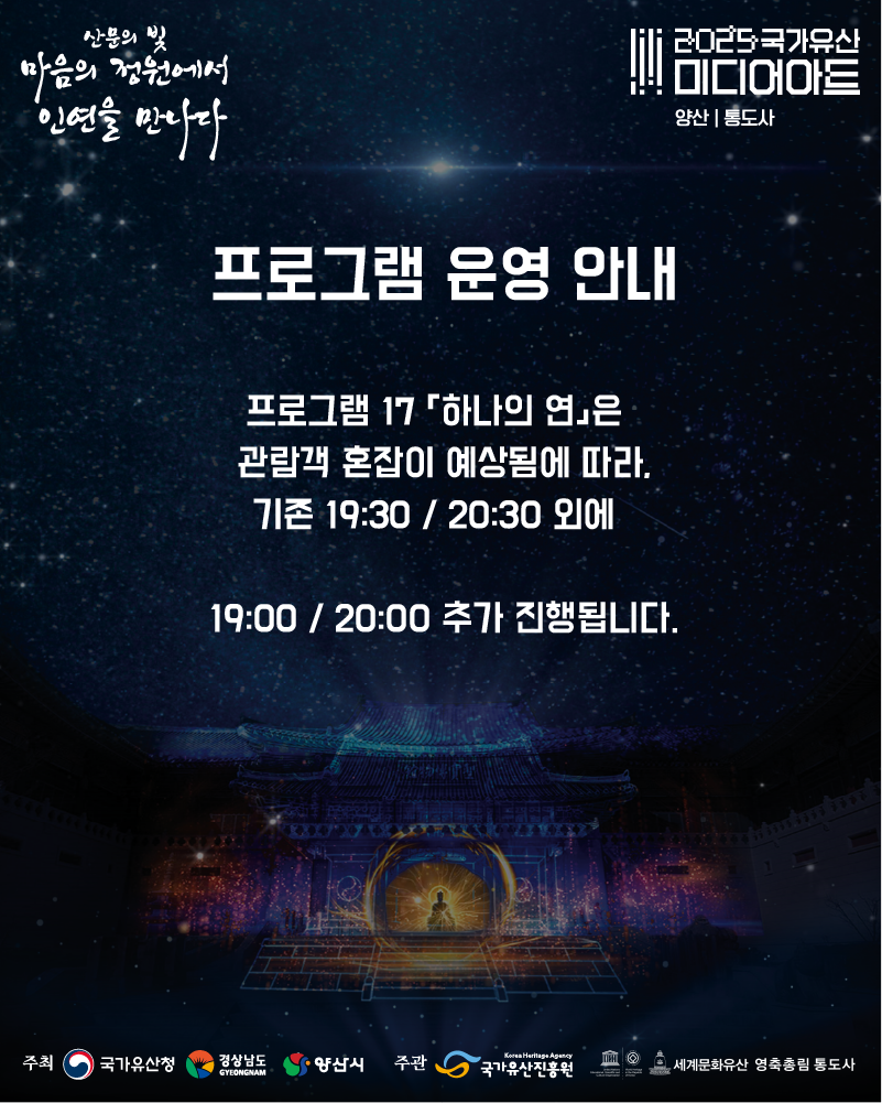 BACK 목록 프로그램 추가 운영 안내 25-10-05 12:33 프로그램 운영 안내프로그램 17 「하나의 연」은 관람객 혼잡이 예상됨에 따라,기존 19:30 / 20:30 외에 19:00 / 20:00 추가 진행됩니다.