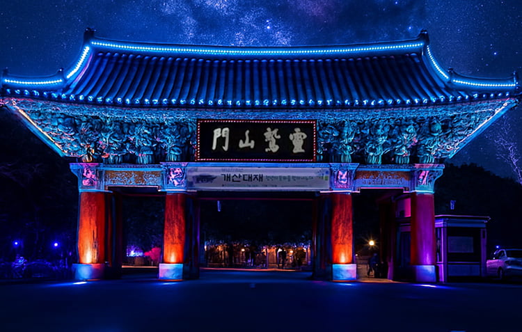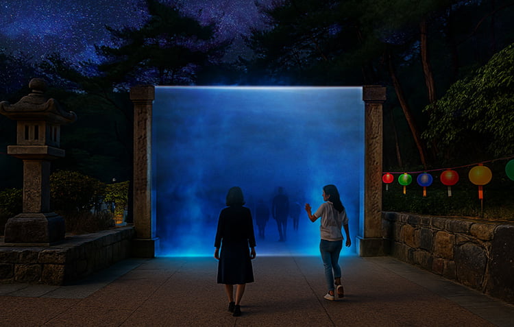 조용히 켜지는 조명 아래, 커다란 산문이 모습을 드러낸다.