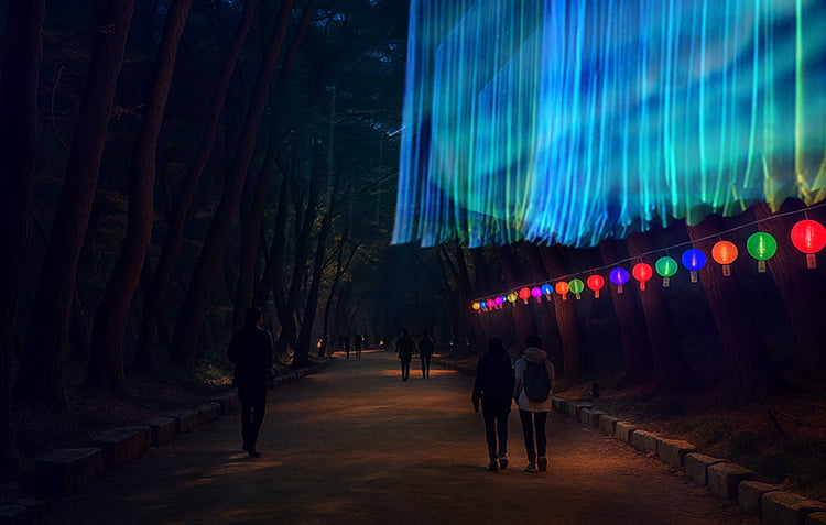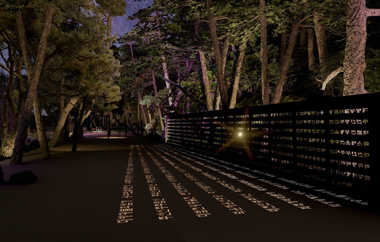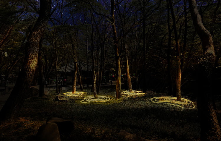 고요한 송수정 뒤편, 나이테 조명이 은은하게 퍼지고 빛들이 숲 속을 떠다닌다.