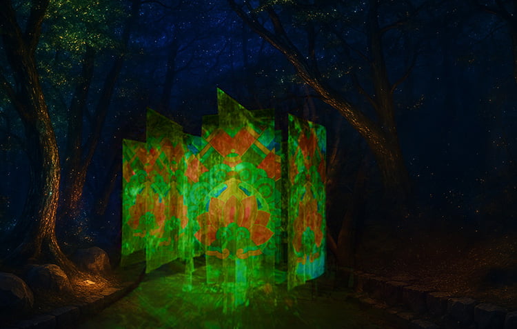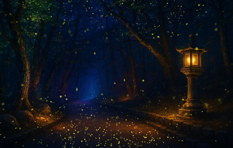 어둠 속 숲, 나무 사이에 반딧불처럼 퍼져 있는 조명.