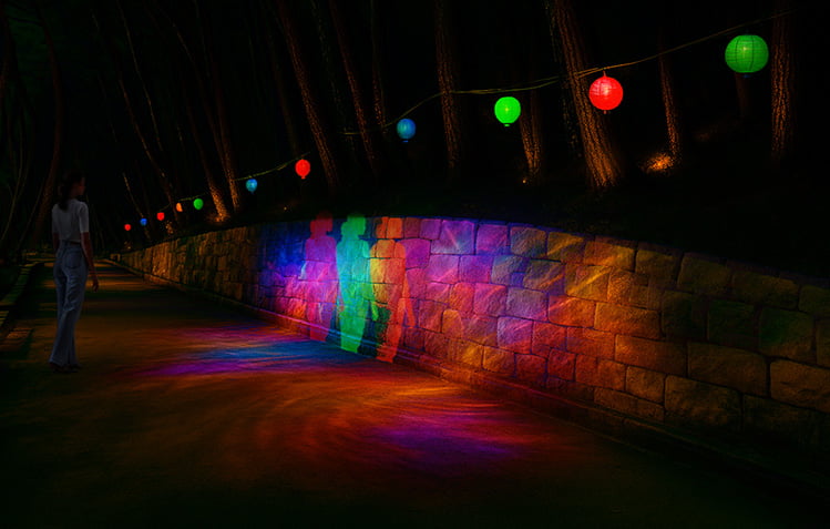 무지개 색의 조명은 서로 다른 존재들이 만들어내는 하나의 파동.